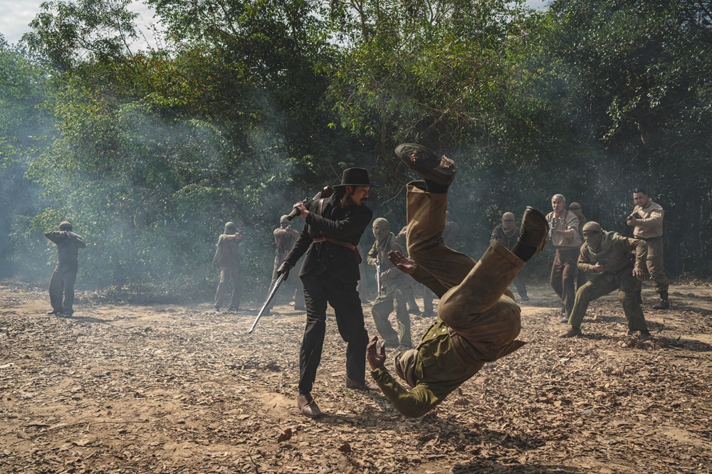 โดยความพิเศษของฉากสุดยิ่งใหญ่นี้คือการรวมทุกองค์ประกอบของหนังแอ็กชันไว้ในซีนเดียว ทั้งทีมนักแสดงนำอย่าง “เวียร์ ศุกลวัฒน์”, “มาริโอ้ เมาเร่อ”, “เป้ อารักษ์”, “โตโน่ ภาคิน” และ “ท็อป ทศพล” ที่ลงเล่นจริง แอ็กชันจริงในหลายช็อตสำคัญ การต่อสู้กับทีมสตันต์ระดับมืออาชีพ พร้อมเทคนิคสลิง เอฟเฟกต์ระเบิดจริง และสเปเชียลเอฟเฟกต์ในท้ายที่สุด ซึ่งทุกฝ่ายต่างทุ่มเทกันสุดชีวิตตั้งแต่เช้ายันค่ำ ถ่ายทำกันอยู่หลายวันกว่าจะได้ซีนต่อสู้ครบรสชาติอย่างที่เห็นในหนัง ท่ามกลางอากาศอันร้อนระอุด้วยอุณหภูมิสูงถึง 40 องศา และฝนตกสลับแดดตลอดทั้งวัน ทั้งฝุ่นและลมจากเอฟเฟกต์ เสื้อผ้าจัดเต็มหลายชั้น พร้อมขนอาวุธและอาคมมาต่อสู้กันจนหมดแม็กทั้งทีมเสือและทีมศัตรู ถือเป็นซีนที่รวมทุกศาสตร์และศิลป์ไว้อย่างครบถ้วนที่สุดแบบโคตรโหด โคตรยาก และโคตรมหัศจรรย์เท่าที่หนังแอ็กชันไทยเคยมีมาเลยก็ว่าได้