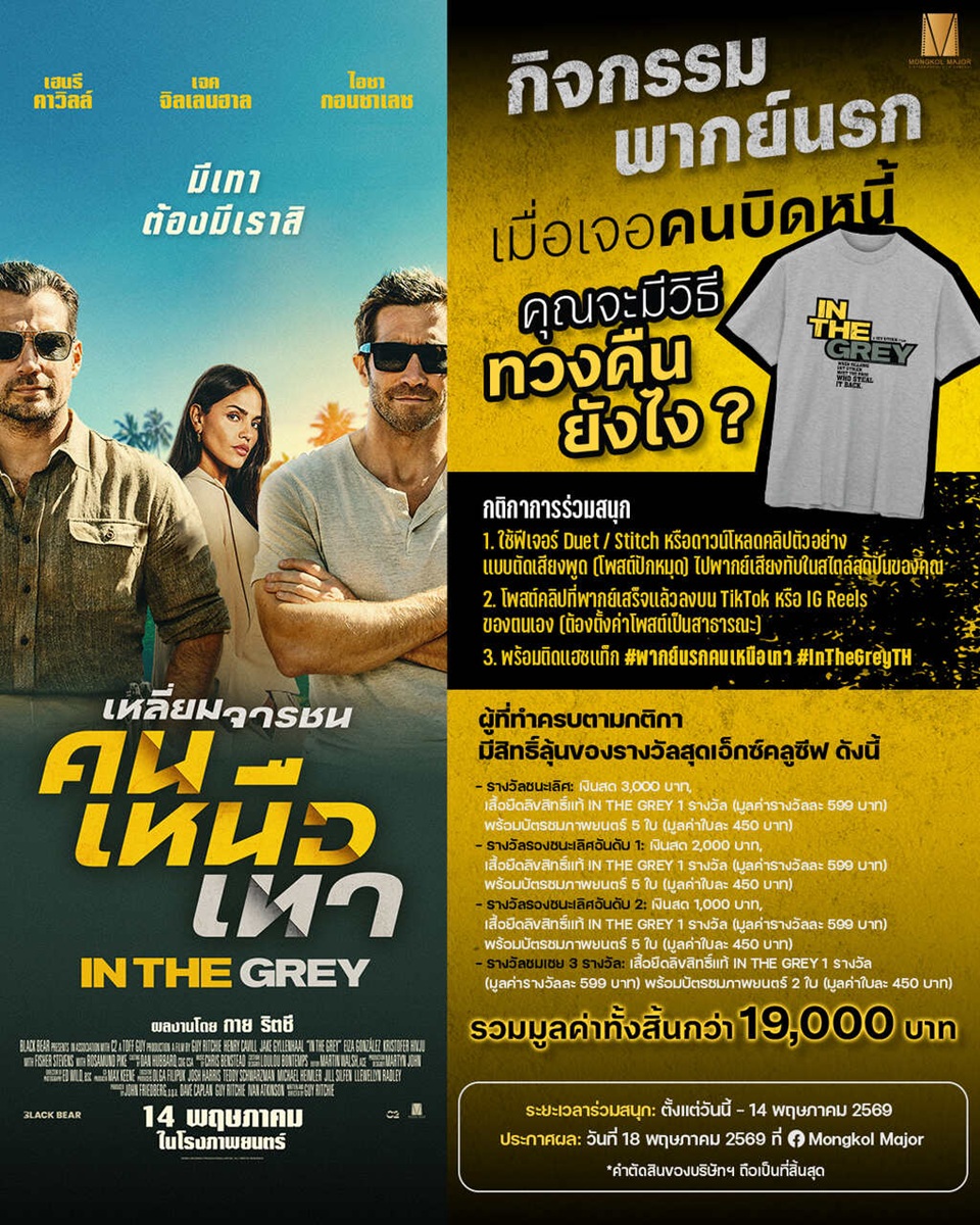 เตรียมตัวร่วมสนุกกิจกรรมสุดมันส์ก่อนไประห่ำเดือดกับ “In the Grey เหลี่ยมจารชน คนเหนือเทา” นำทัพโดยสองนักแสดงตัวตึงแห่งยุค “เจค จิลเลนฮาล” (Spider-Man: Far from Home, Brokeback Mountain) และ “เฮนรี คาวิลล์” (Man of Steel, The Ministry of Ungentlemanly Warfare) ร่วมด้วย “ไอซา กอนซาเลซ” (Baby Driver, Fast & Furious Presents: Hobbs & Shaw) และ “โรซามันด์ ไพก์” (Gone Girl, Now You See Me: Now You Don’t) 14 พฤษภาคมนี้ ในโรงภาพยนตร์