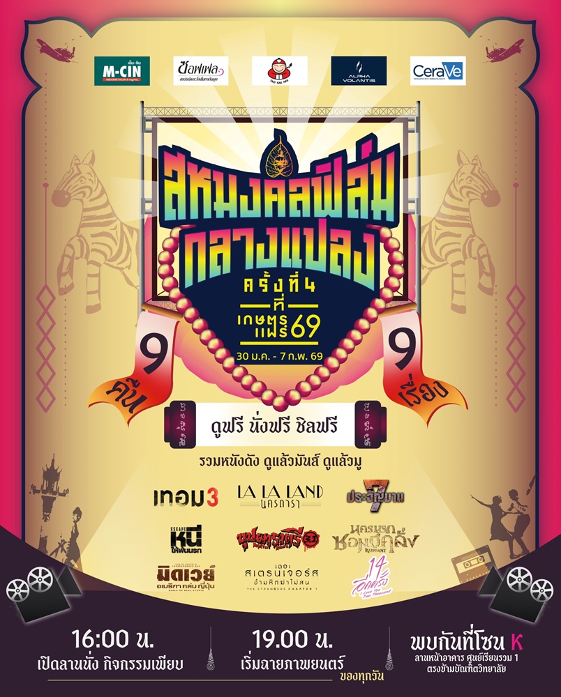 กลับมาอีกครั้งกับบรรยากาศการดูหนังที่คุ้นเคย “สหมงคลฟิล์มกลางแปลง ครั้งที่ 4″ ที่ “สหมงคลฟิล์ม อินเตอร์เนชั่นแนล” ขอเอาใจคนรักหนังทุกเพศวัยพร้อมสับเปลี่ยนหมุนเวียนภาพยนตร์ไทยและต่างประเทศเรื่องดังกระแสดีมาฉายให้ “ชมฟรี! 9 เรื่อง 9 คืน” ที่งาน “เกษตรแฟร์ 2569″ ณ บริเวณลานหน้าอาคารศูนย์เรียนรวม 1 (ตรงข้ามบัณฑิตวิทยาลัย) โซน K มหาวิทยาลัยเกษตรศาสตร์ วิทยาเขตบางเขน ตั้งแต่วันที่ 30 มกราคม – 7 กุมภาพันธ์ 2569