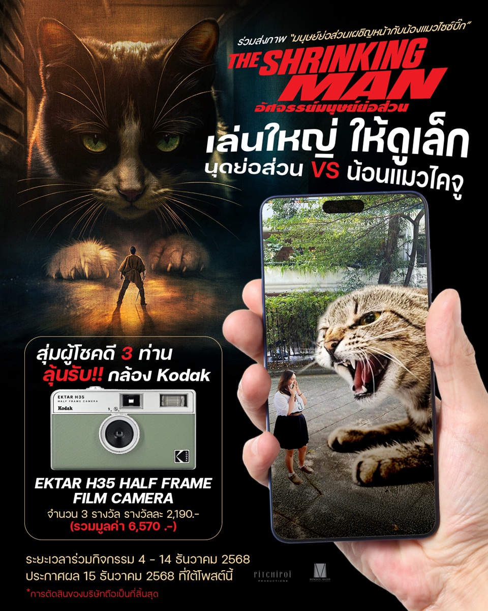 โดยจัดทำภาพรูปแบบใดก็ได้ด้วยคอนเซปต์ “มนุษย์ย่อส่วนต้องเผชิญหน้ากับน้องแมวตัวใหญ่” แล้วนำมาลงในคอมเมนต์ใต้โพสต์กิจกรรมฯ ทางเพจ FB/MongkolMajor พร้อมติด #เล่นใหญ่ให้ดูเล็ก #TheShrinkingMan ลุ้นรับ “กล้อง Kodak EKTAR H35 Half Frame Film Camera” มูลค่ารางวัลละ 2,190 บาท รวมมูลค่าทั้งสิ้น 6,570 บาท (ขอสงวนสิทธิ์เฉพาะผู้ทำครบตามกติกาเท่านั้น)